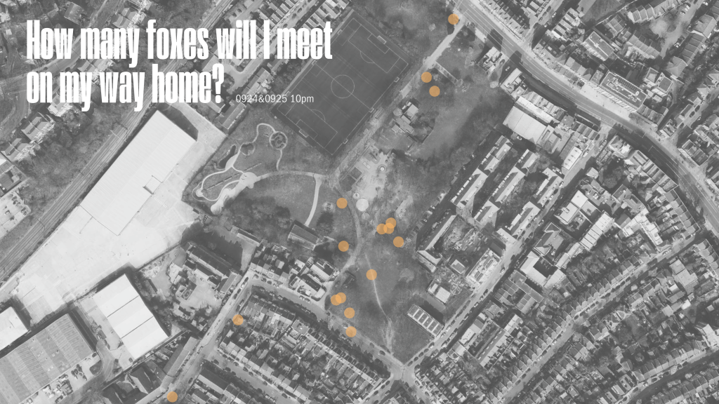 One noteworthy fact is that I frequently encounter foxes here. This has sparked my keen interest in them. Since this was a week-long project, I took the time to document how many foxes will I meet on my way home and visualized their locations on a map.